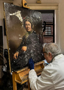 De Lovie vzw contacteerde kunstrestaurateur Frederik Cnockaert voor de restauratie en nodige expertiseverlening. Frederik Cnockaert plaatst het schilderij in zijn context en kaart het belang van de restauratie aan: “Het portret van mevr. Van Renynghe dateert uit de 2de helft van de 19de eeuw. Het is een prachtig schilderij met een grote historische waarde voor de streek. Momenteel bevindt het zich echter in een zeer slechte staat. Uit eerdere testen bleek dat de oude vernislaag er helemaal af moet om het schilderij in ere te herstellen. Niet enkel de grote scheur, maar ook de losliggende verf dient opnieuw behandeld te worden. Bovendien zit er schimmel, stof en vuil op het oude doek die de verf aantast. Hoe langer hiermee gewacht wordt hoe minder mogelijkheden er zijn om het werk in zijn oude glorie te herstellen. Het wordt een uitdaging, maar het loont de moeite om dit mooie portret te redden.”